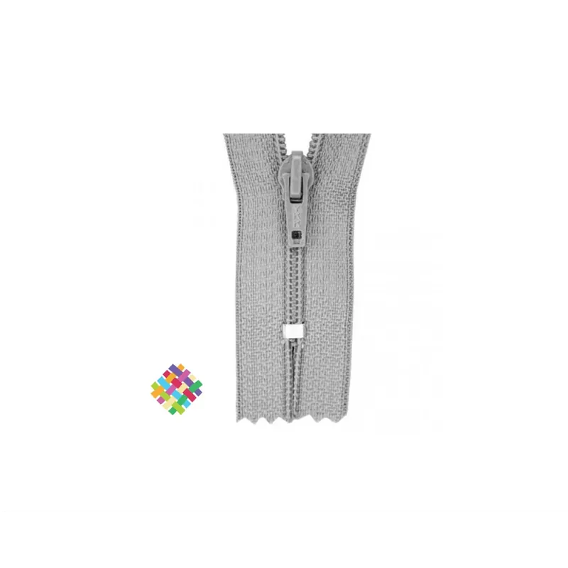 Deze YKK nylon rits is een gangbare rits dat regelmatig gebruikt wordt voor kleding, kussens en tassen. Deze rits kan niet los door de blokkade aan de onderkant. Het rits gedeelte (een spiraal) is gemaakt van kunststof en de tape van polyester. De brede vertanding is 3mm en de schuiver is geschilderd.