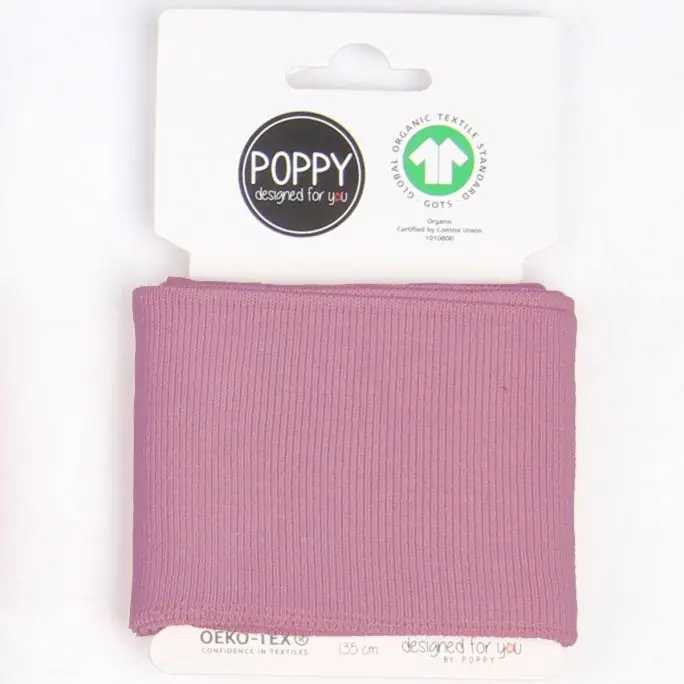 Met deze lavendel Poppy boordstof cuffs van biologische katoen met 10% elastan maak je in een handomdraai mooie manchetten of taille-boord aan de mouwen van een shirt en trui, onderaan een jas, jurk, broek of sweater. Verkrijgbaar in vele kleuren.