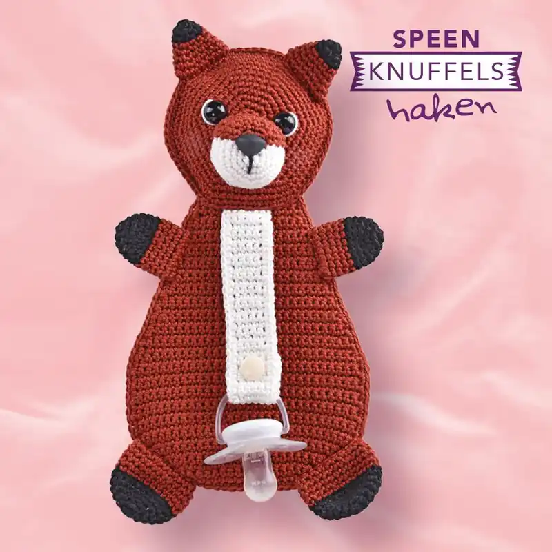 In het garenpakket zitten alle benodigde garens, de veiligheidsoogjes en -neusjes en de drukknoop om de vos te haken. Het haakpatroon van de speenknuffel vind je in het boek ‘Speenknuffels haken’. De speenknuffel wordt ongeveer 24 cm. Wordt het vosje de nieuwe favoriete speenknuffel van jouw (klein)kind? Of haak hem als kraamcadeau!