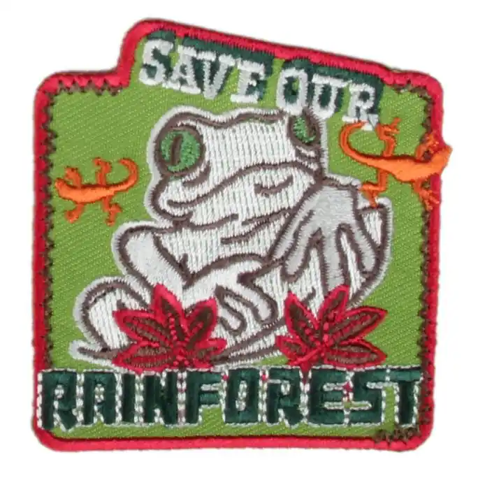 Onze groene kikker strijkapplicatie met de tekst ‘Save our rainforest’ roept op tot actie voor onze kostbare ecosystemen. Met een formaat van 60mm x 60mm draag je niet alleen een charmante toevoeging aan je outfit, maar ook een krachtige boodschap van behoud en bescherming.