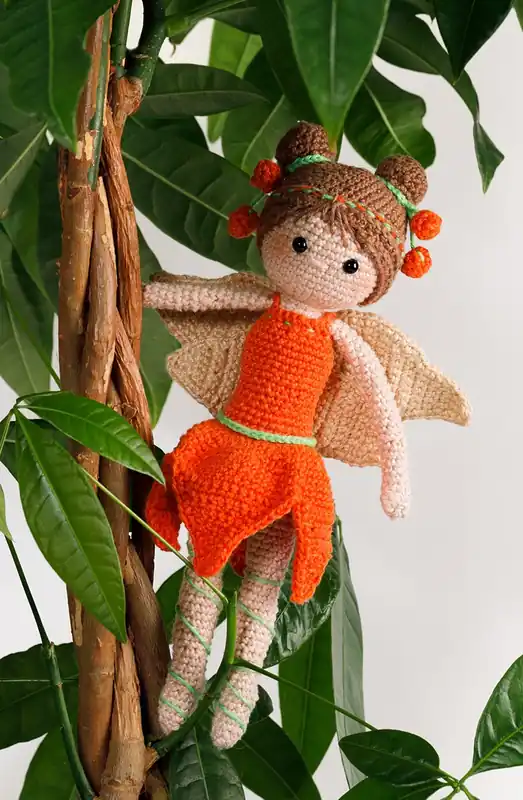 Phoebe houdt van planten, zo heeft ze haar haren versierd met Physalis, het lampionplantje dat in de herfst vol hangt met oranje lampionnetjes. Ze komt graag bij jou wonen als je haar haakt en is benieuwd naar jouw planten thuis.