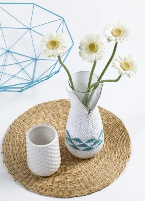 Dat staat leuk! Heb je een vaas met een leuk model, maar is hij niet meer zo mooi om te zien? Haak er een tof jasje met een rits omheen en hij kan weer tijdenlang mee. Je hebt wit haakkatoen nodig, een bolletje haakkatoen mini kleur 072 Glass blauwgroen (Echtstudio), haaknaald 3, een glazen vaas en een rits van 8 cm.