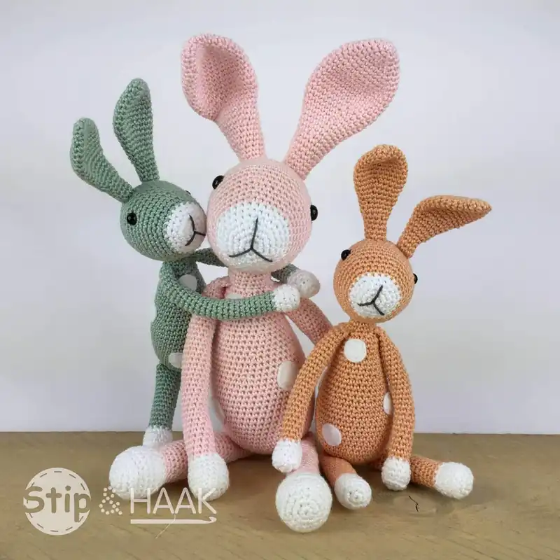 Snuf Konijn is één van de vele originele haakpatronen van Stip en Haak. Het patroon van Snuf konijn is te bestellen via Stip en Haak. Met dit garenpakket kun je daarna direct aan de slag. Snuf konijn Mini wordt ongeveer 20 cm groot (zonder oren gemeten).