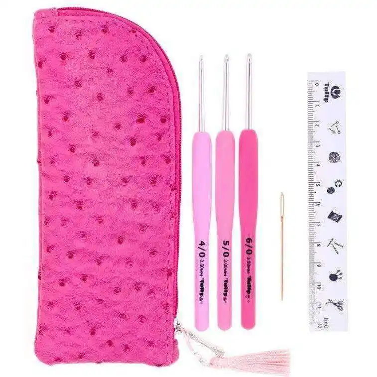 Deze set bevat 3 haaknaalden in maten 2.50, 3.00 en 3.50mm, 1 stopnaald en 1 liniaal. De set wordt geleverd met een stijlvol roze etui in leder-look.