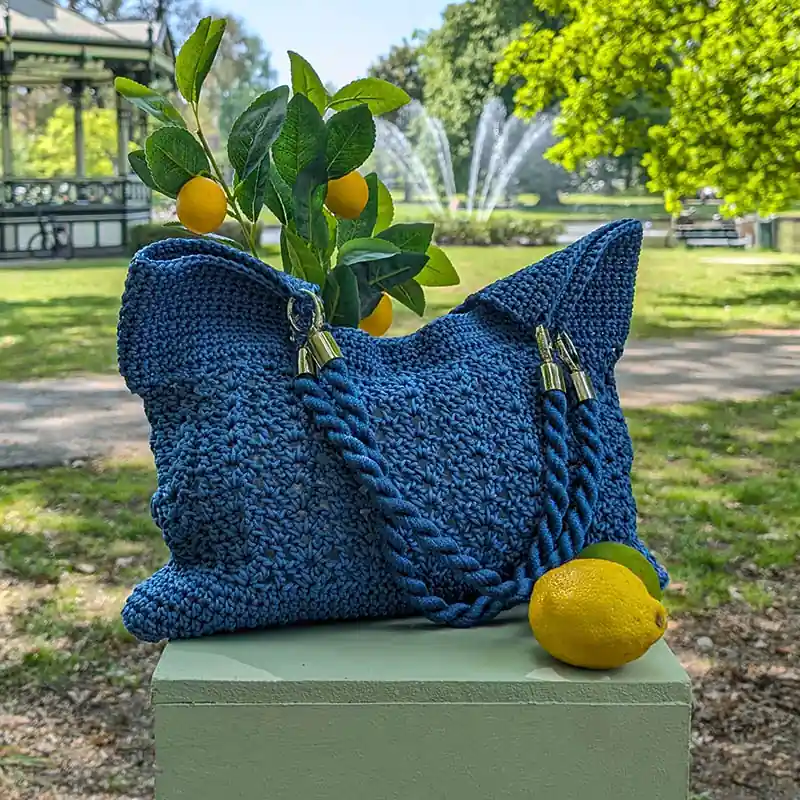 De tas op de foto is gehaakt met kleur 31. Wil je graag een andere kleur? klik dan op Borgo de Pazzi Inda, kies je kleur en geef het kleurnummer door in het opmerkingen vak aan het eind van je bestelling. Let op: de hengsels die meegeleverd worden zijn in de kleur die op de foto staat.