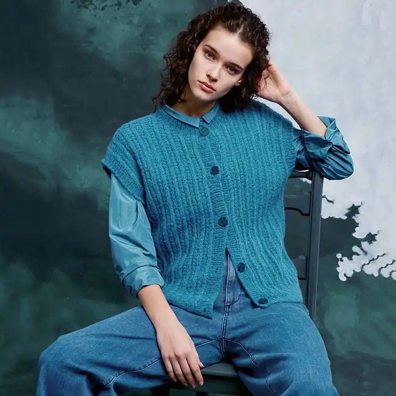 Het mouwloze vest Giulia heeft een fijn kabelpatroontje wat prachtig uitkomt door het zachte, pluizige alpaca garen. Het is een heerlijk model om over een blouse of shirt te dragen, met de knoopjes dicht of open. Makkelijk te combineren met een broek, jurk of rok. Kortom; dit mouwloze damesvestje verveelt nooit!