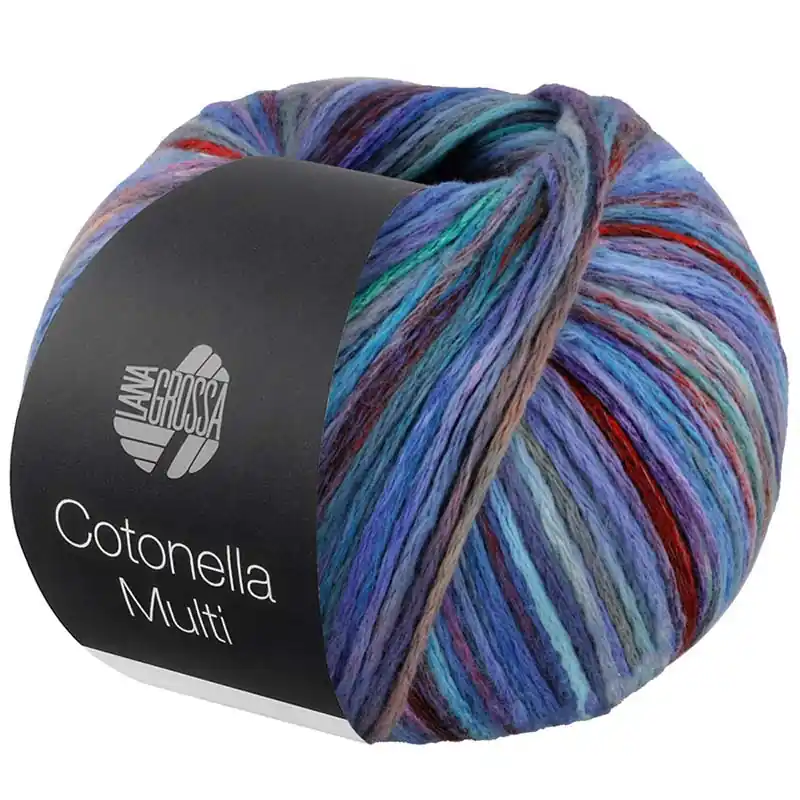 Lana Grossa Cotonella Multi is een zacht katoengaren met prachtig kleurverloop. Met ongeveer 4-5 bollen brei of haak je een basistrui in maat 38-40. Door de verschillende kleuren is er voor iedereen een leuke optie. Het garen is een bedrukt kettinggaren gemaakt van 75% katoen en 25% polyacryl.