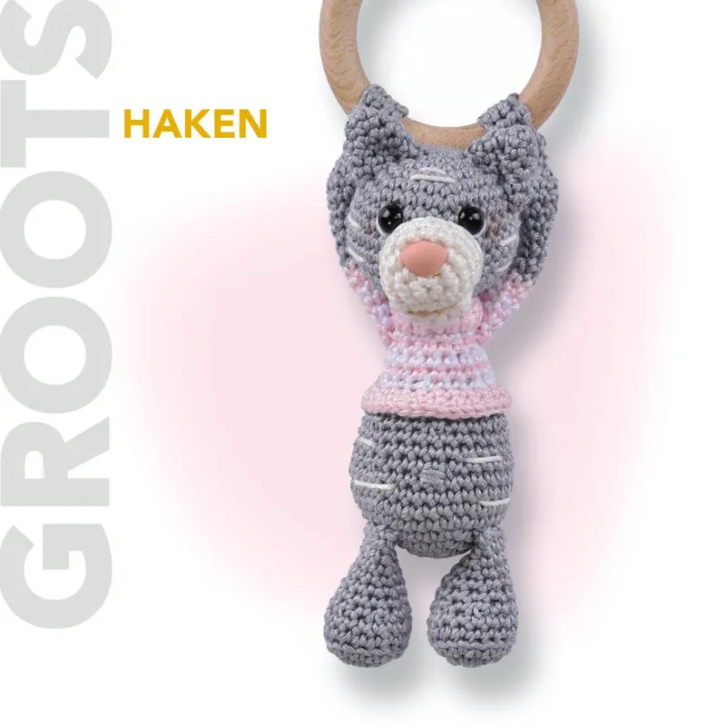 Het bijtring bungelpoesje is één van de vierentwintig patronen uit het boek Groots haken. Inclusief de bijtring wordt de poes ongeveer 21 cm groot. Superleuk om voor jouw (klein)kindje te haken of om te geven als handgemaakt kraamcadeau!