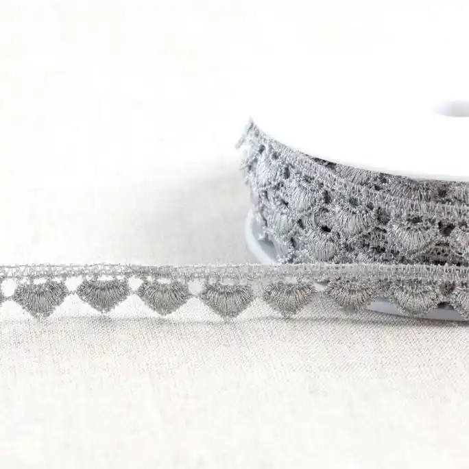 Het kant heeft een sierlijk motief en een hartjesrand aan de onderkant.