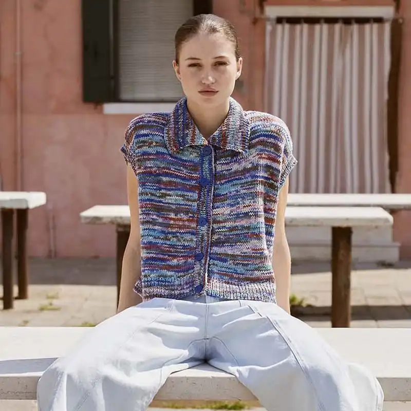Het mouwloze damesvest Jule is een hip model wat je deze zomer vaak aan zult hebben. Je kunt het als vest dragen, maar ook leuk als zomertop. Door de mix van kleuren past het overal bij en verveelt het nooit. Je breit dit mouwloze vestje met het 100% katoen garen, Lang Yarns Lisboa.