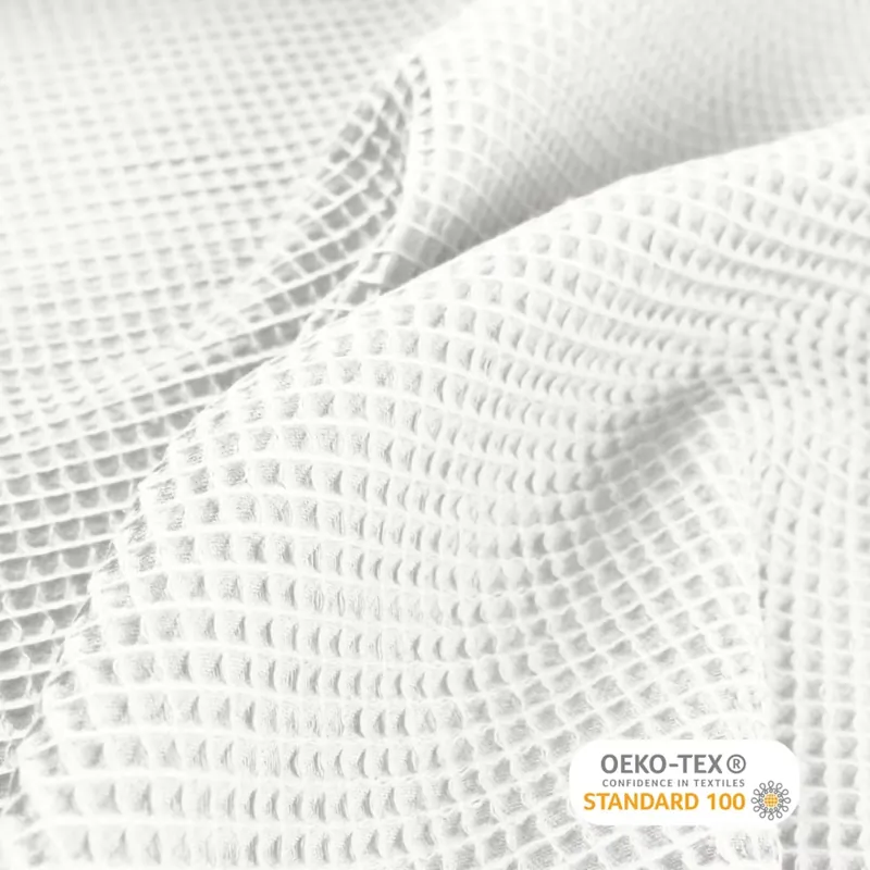 Onze wafel katoen stof van 230 gr/m² is een stevige, natuurlijke stof van 100% katoen met de kenmerkende wafelstructuur. Deze geweven structuur maakt de stof luchtig, goed absorberend en heerlijk zacht na het wassen. Dankzij het Oeko-Tex Standard 100 keurmerk ben je verzekerd van een veilige, huidvriendelijke stof die vrij is van schadelijke stoffen.